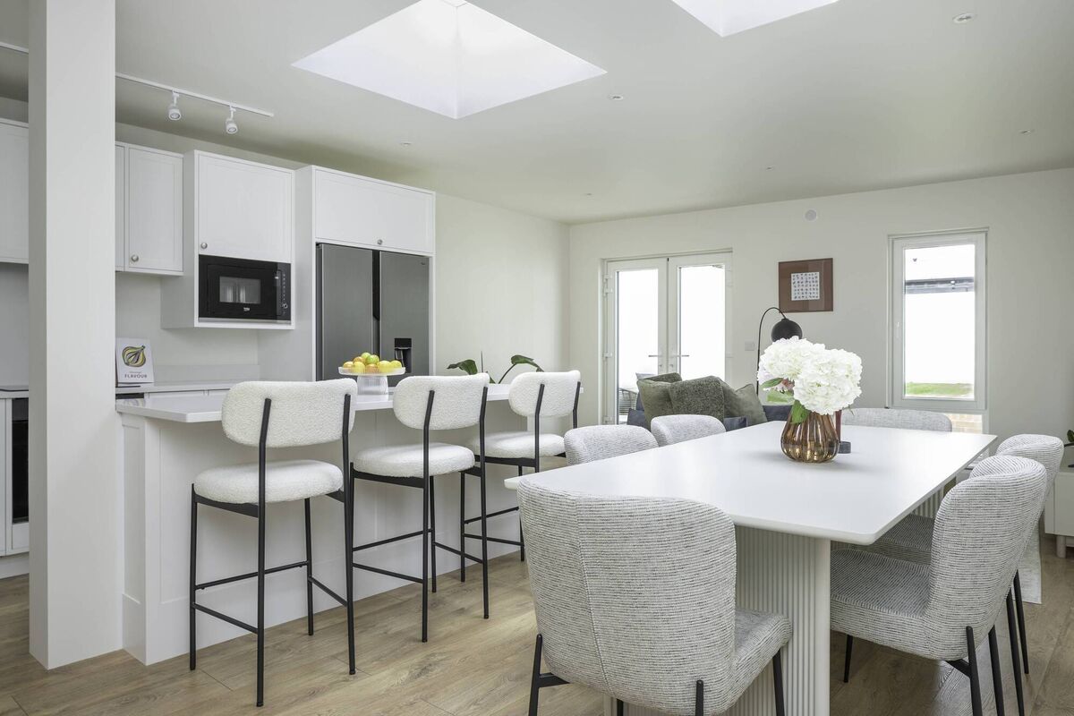 Downstairs in the 84 sq meter house, there’s a guest WC off the hallway and,at the rear, a spacious contemporary kitchen/dining/living room with oak laminate flooring, two skylights and stylish white units and a large island unit.