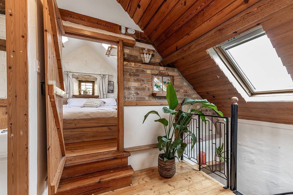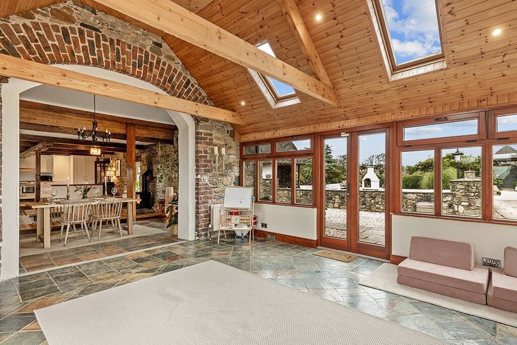 The interior, like the exterior, has exposed stone and brick work as well as a great many timber beams. The large central living /dining room has a kitchen at one end and an archway open into a sunroom at the other. There’s also a utility and guest WC and a curved staircase leading to the upstairs which has a bathroom and three bedrooms (one en suite).
