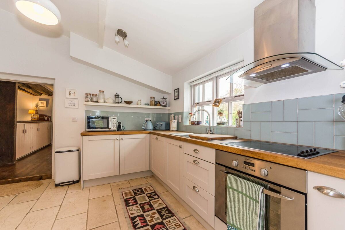 The front living room has a cast iron fireplace and a timber beam and is open plan with a dining room at the rear. Adjoining the dining room is an extension housing a kitchen with shaker style cream units with hardwood countertops as well as a utility room. There’s also a guest WC and a ground floor bedroom. The upper level has a tiled bathroom and two prettily decorated bedrooms. Although upgraded, the property has an E1 BER so this may need to be looked at by a new owner.