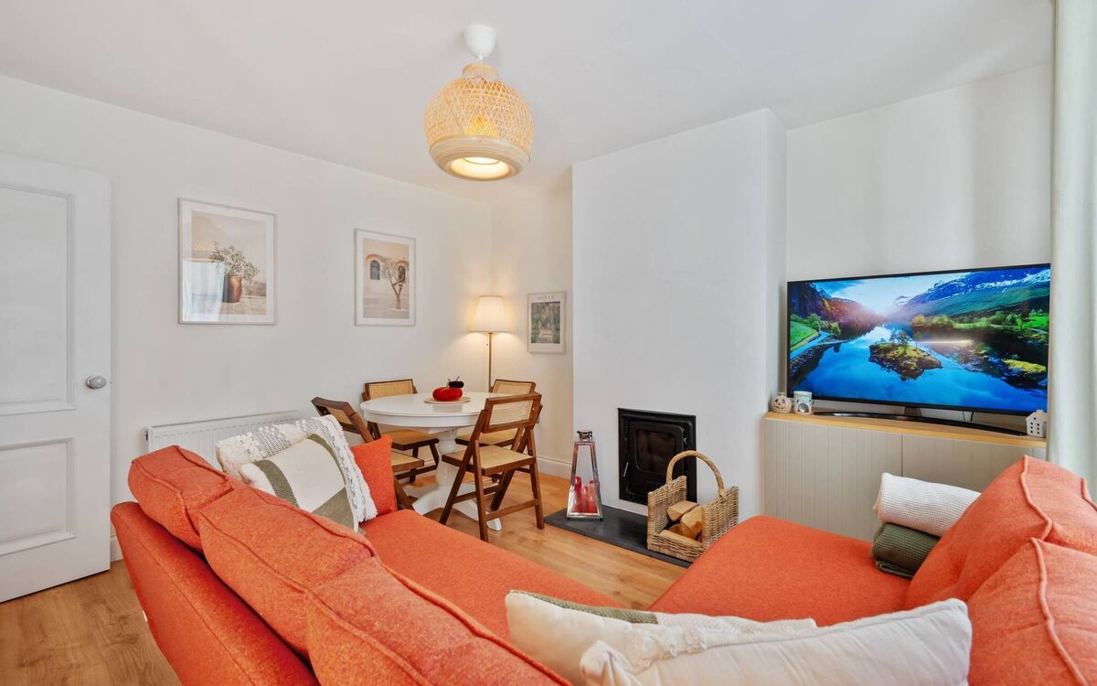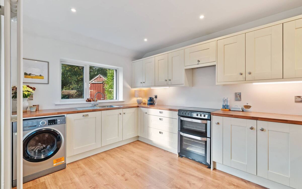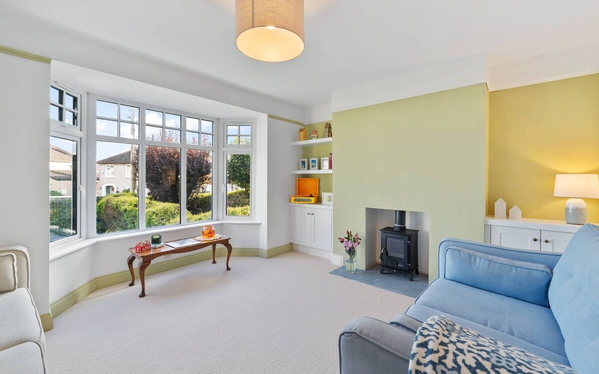 There’s also a new kitchen and appliances, new sanitary ware, new rads, two wood burning stoves in place of the old tiled fireplaces in the front and back living area, new flooring pretty much throughout, and a bank of built-ins in one of the two double bedrooms, with original ‘mid-century’ look ones kept in the front main bed with bay window, while the single/third bedroom is presented as a home office.