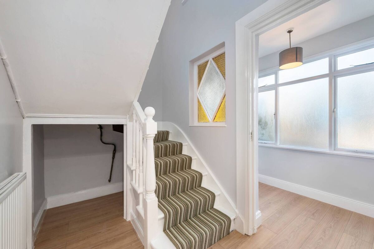 Modernising the house did not mean sacrificing all of its original features. A coloured glass window has been retained inside the porch.