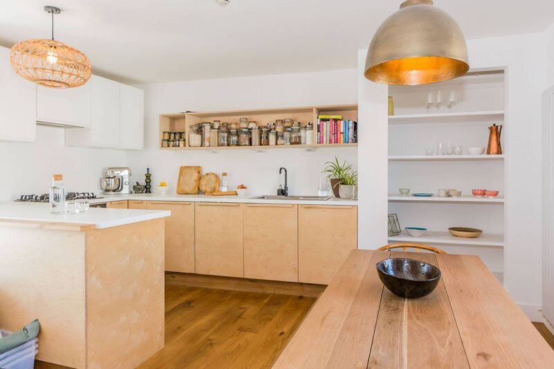 Entry is via private stairs off a shared street-level hall, leading to a first-floor main living and kitchen area, with birch ply units, open display shelving, and top-brand appliances including Smeg, Schott and Liebherr.