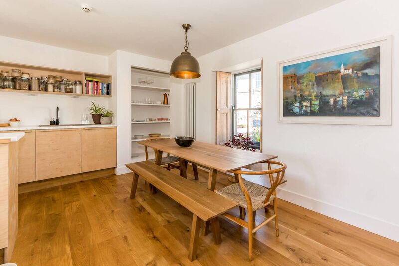An integrated wood-burning stove sits between display bookshelves. Flooring on both levels is French oak, with natural-grain timber stairs. Windows are new sliding sashes with reclaimed pine shutters, and door handles are brass.