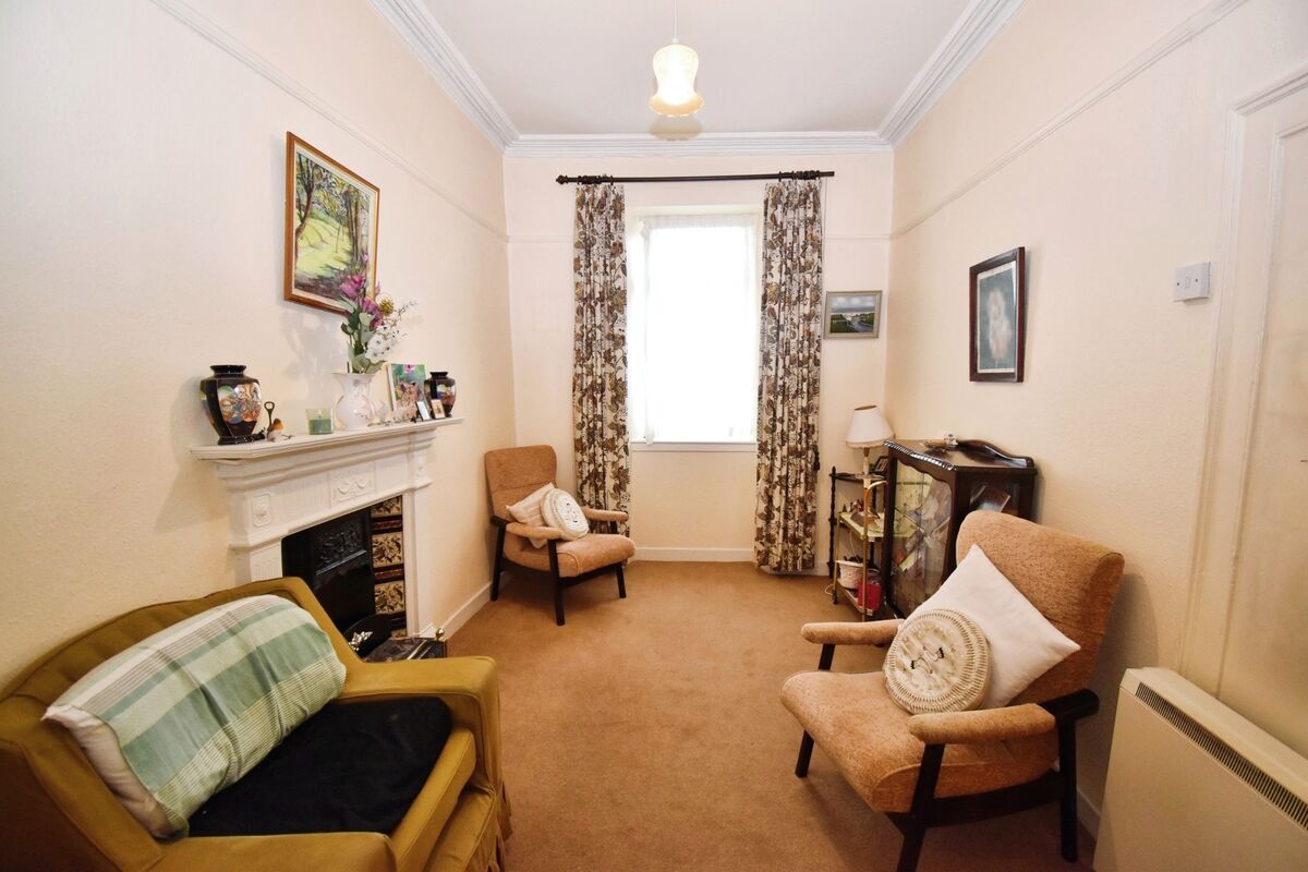 At the front, it has a timber floored living room with a cast iron fireplace and, at the rear, a spacious tiled kitchen with modern cream units and patio doors.