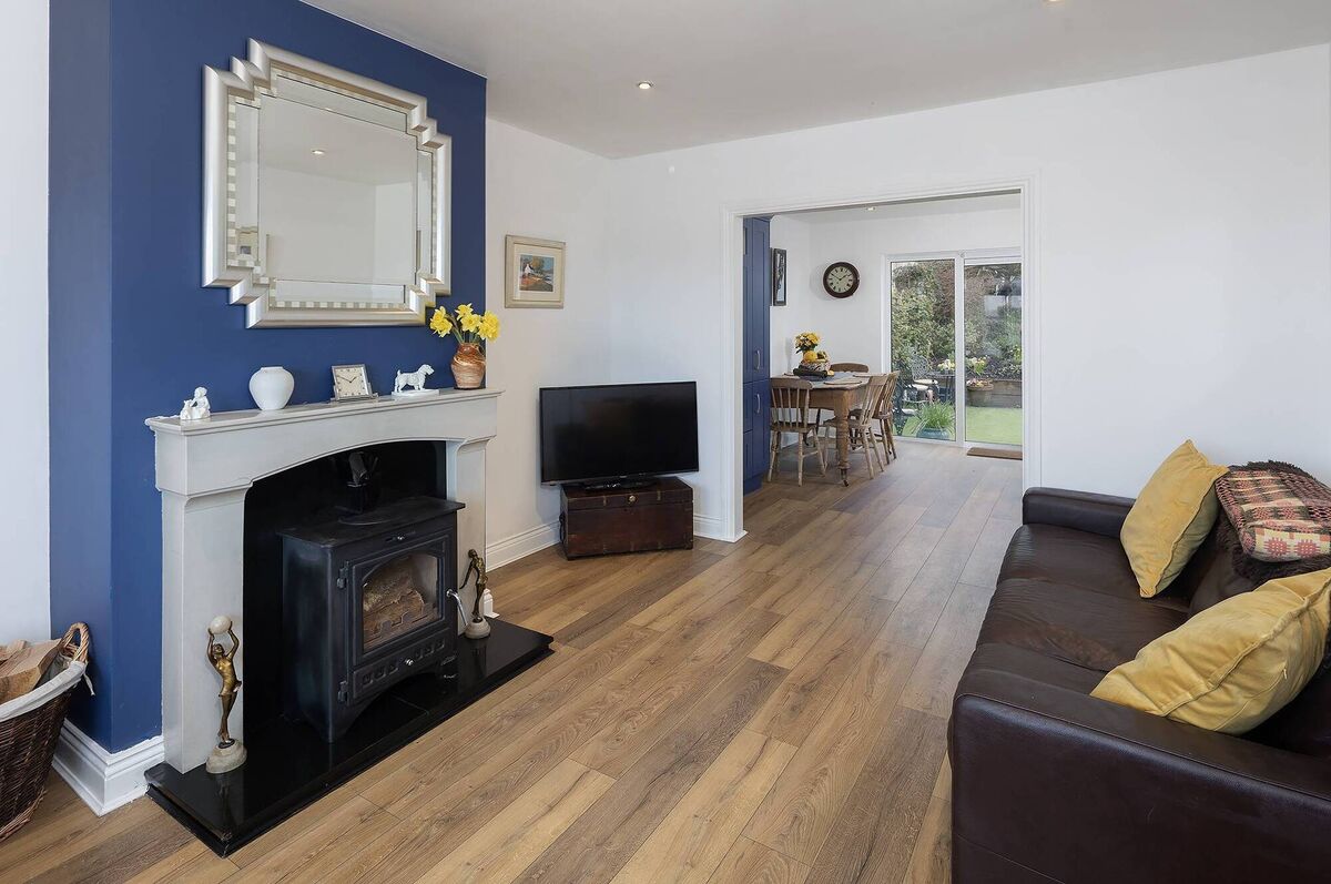 At the front of this terraced house is a bright living room with a bay window to catch those sea views. And though the fresh and welcoming-looking kitchen/dining is at the back of the house it brings that nautical chic vibe on through with the crisp blue units and peninsula.