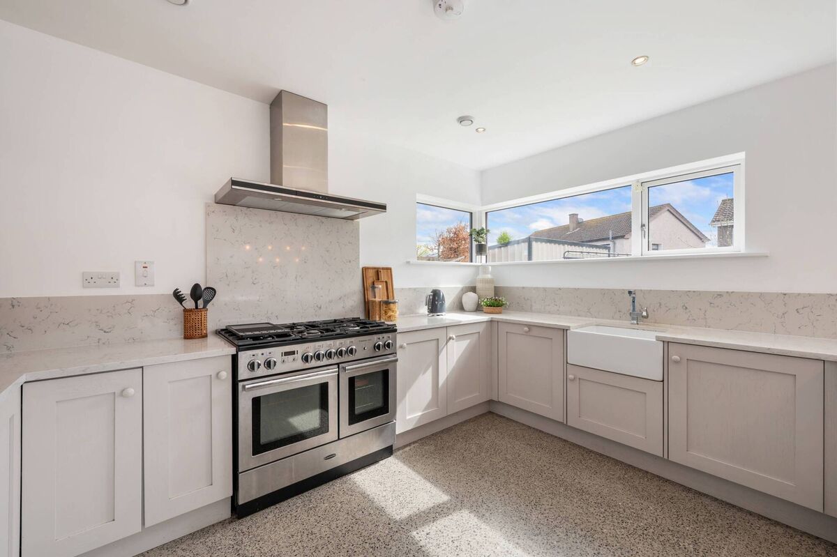 The house delivered in spades. Natural light is at a premium throughout. The window count (all Aluclad) is high. A half apex window over the front door is architecturally pleasing and light enhancing. A long picture window lights up the staircase. Veluxes are plentiful in the upstairs rooms. Tall wraparound glazing overlooking a patio in the open-plan kitchen/ dining/ living area captures light from the south and the west, while the kitchen area is brightly lit by a smaller corner window.