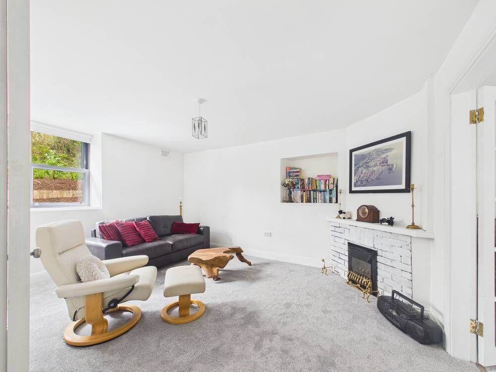 The lower level of the property has a timber floored sitting room with a fireplace, a teal blue colour scheme and a bay window at the front. Double doors at the rear open into a kitchen with white units and doors to a balcony with views of green spaces and the Douglas Estuary in the distance.
