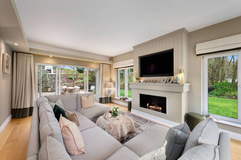 Off the kitchen is an elegant sitting room with bioethanol fireplace, a generous array of tall windows and sliding glass doors to an expansive patio.