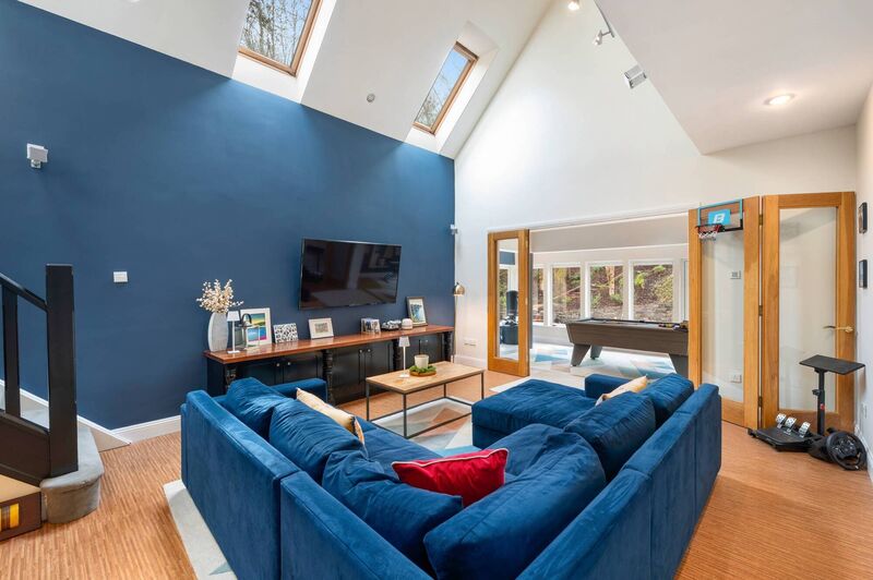 At the far end of the house is a formidable TV room with vaulted ceiling, linked to a games room — with pool table, drum kit, and keyboard — glazed on all sides, with double doors to another large patio.