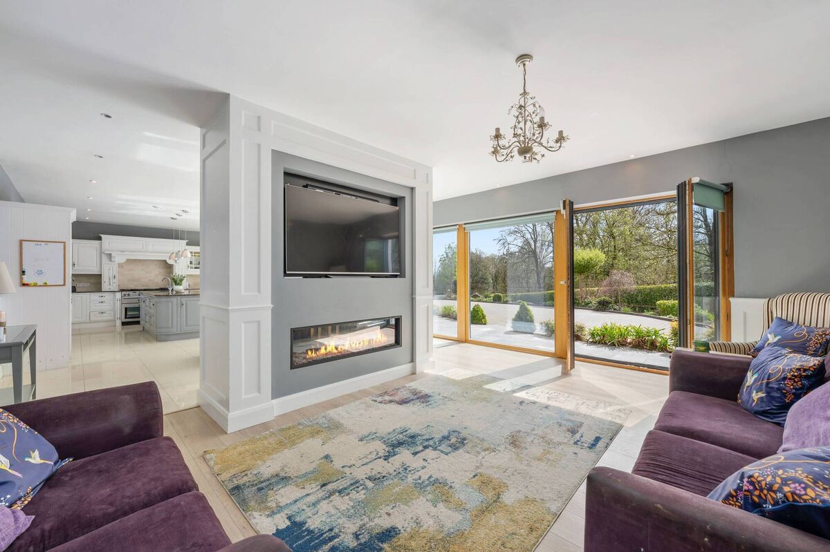 The adjoining living area has a wall-mounted Gazco electric fire featuring a light control setting — so you can easily switch up the ambiance depending on the situation.