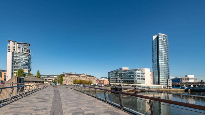 The bridge over the River Lagan in Belfast on a sunny day.