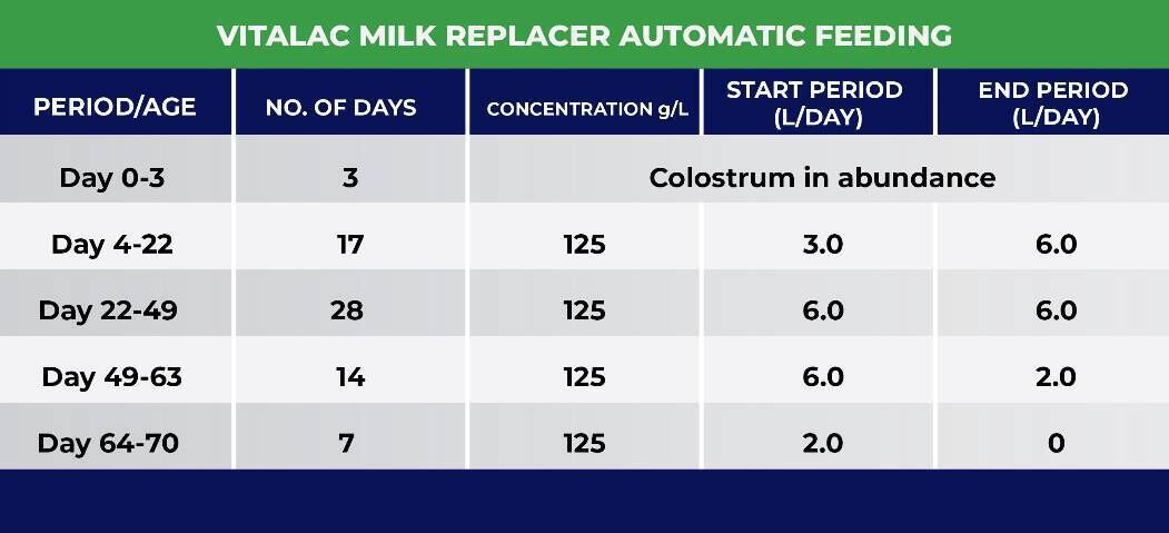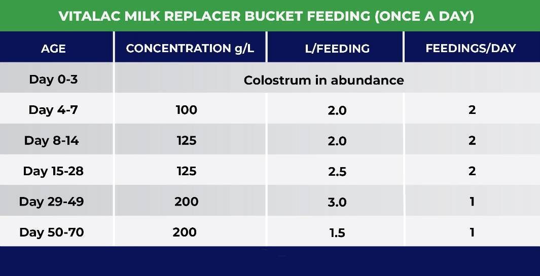 Milk replacer should replicate the role of good quality whole milk, typically offered at 12.5% milk solids (E.g. 125 g powder, into 875ml clean water to make 1 litre of milk). Feeding a calf twice-a-day at 6 litres/day would result in offering the calf 750 g of powder/day.