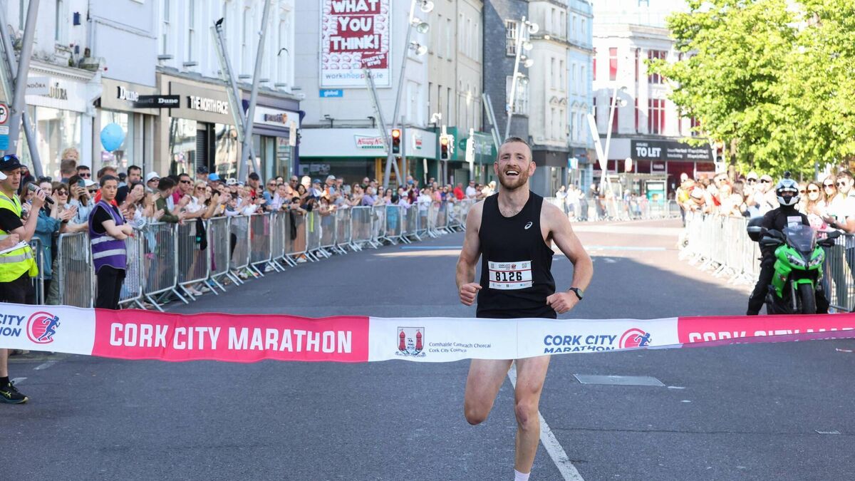 Countdown to Cork City Marathon 2024 on June 2nd: Denis Hegarty from Watergrass Hill A.C. is first past the finish line of the inaugural 10k at the 2023 Cork City Marathon, cheered on by 12,500 people on a beautiful sunny day. Photos: Darragh Kane
