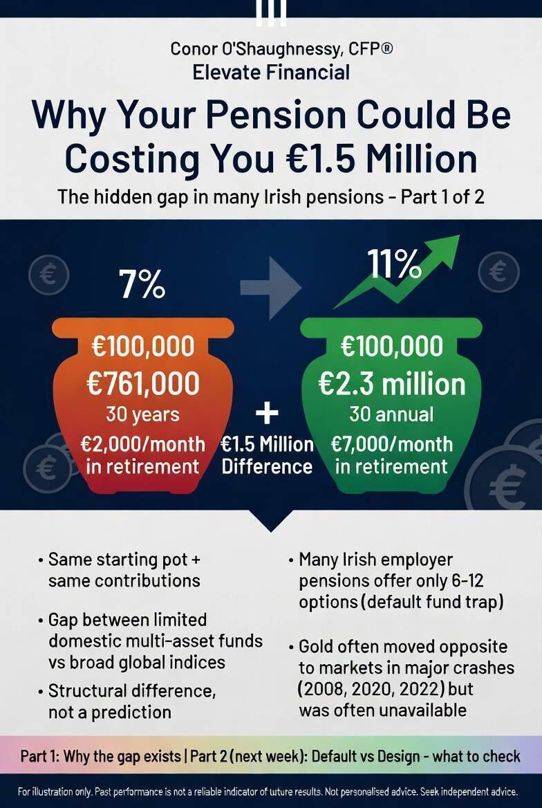 That gap comes down to one thing. The difference between a pension growing at 7% per year, which is broadly where most standard Irish employer schemes land over the long term, and one growing at 11%, which is closer to what broad global indices have delivered over the last 50 years.