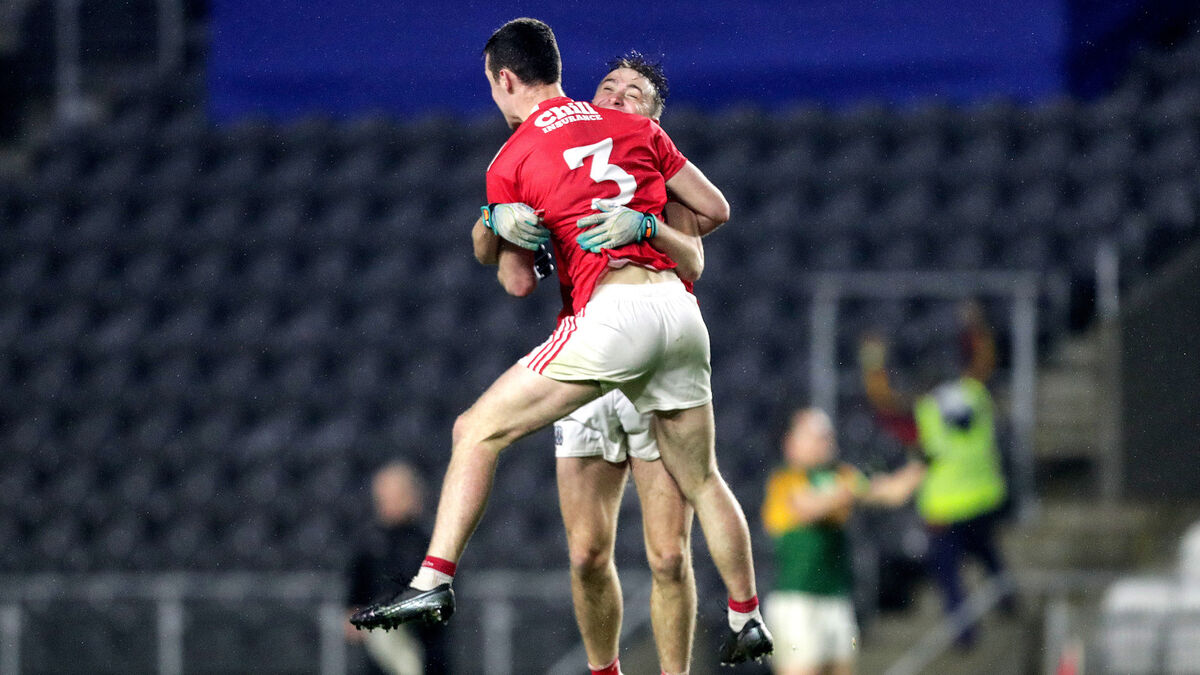 Maurice Shanley celebrates with Sean Meehan after Cork’s dramatic win over Kerry at Páirc Uí Chaoimh. Cork were entitled to enjoy this win, having gone eight years without beating their great rivals, but Kerry will find defeat hard to stomach because they missed several big chances. Picture: Inpho/Lazlo Geczo