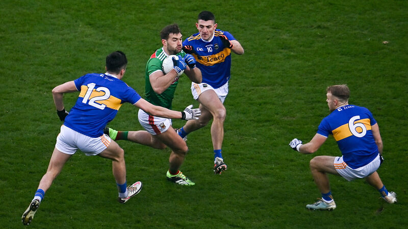 CENTRE OF ATTENTION: Mayo’s Aidan O’Shea looks to burst past Conal Kennedy, Colin O’Riordan, and Kevin Fahey of Tipperary at Croke Park.