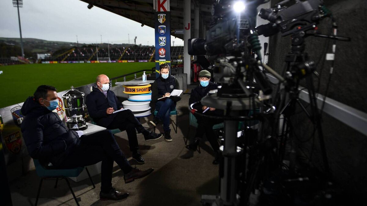 : Oisín McConville, Peter Canavan, Enda McGinley and Mark Sidebottom prepare for a BBC Northern Ireland Championship broadcast at Celtic Park last year. Picture: David Fitzgerald/Sportsfile