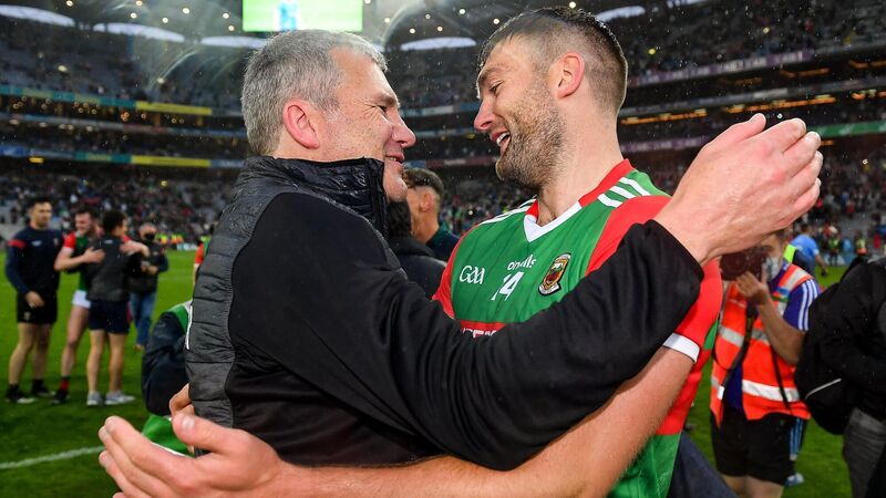 Mayo manager James Horan, left, and Aidan O'Shea after their side's victory over Dublin. Picture: Seb Daly/Sportsfile
