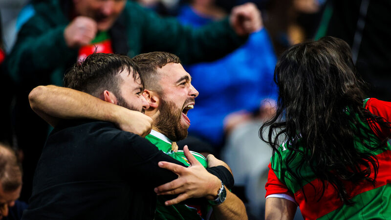Mayo fans celebrate as Tommy Conroy puts over another point in the first half of extra-time against Dublin. Picture:Â INPHO/James Crombie