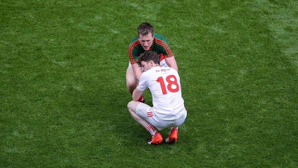 Cillian O’Connor of Mayo consoles Rory Brennan of Tyrone at the end of the GAA Football All-Ireland Senior Championship Quarter-Final match between Mayo and Tyrone at Croke Park. Picture: Daire Brennan/Sportsfile