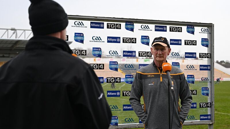20 March 2022; Kilkenny manager Brian Cody is interviewed by Daithí De Mordha for TG4 after the Allianz Hurling League Division 1 Group B match between Kilkenny and Waterford at UMPC Nowlan Park in Kilkenny. Photo by Ray McManus/Sportsfile