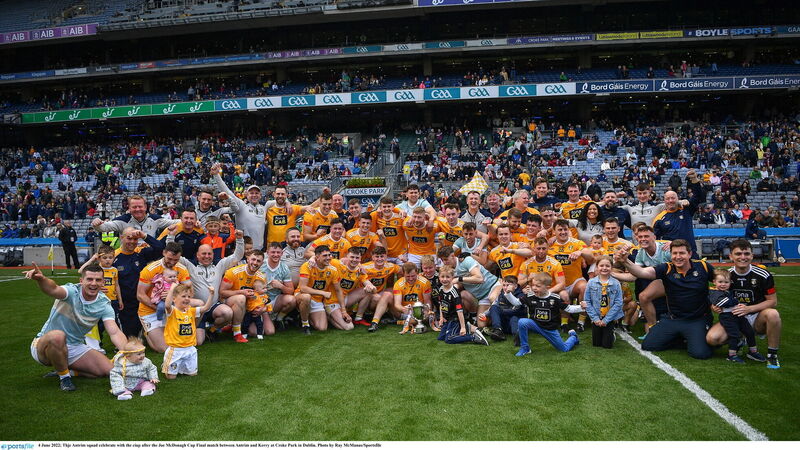 4 June 2022; Thje Antrim squad celebrate with the ciup after the Joe McDonagh Cup Final match between Antrim and Kerry at Croke Park in Dublin. Photo by Ray McManus/Sportsfile