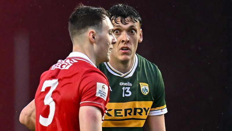 David Clifford of Kerry eyes up Daniel O'Mahony of Cork after O'Mahony was shown a yellow by referee Barry Tiernan after a tussle off the ball. Pic: Piaras Ă“ MĂdheach/Sportsfile