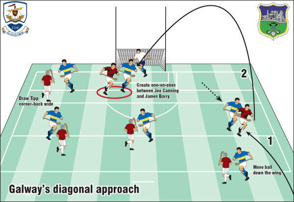 Aerial, fast ball in from the wings is always more difficult to deal with for a full-back than a straight central delivery. Galway could profit by moving the ball down the wing to the 45m line to an outcoming corner-forward and then diagonally in towards the edge of the square to Canning.