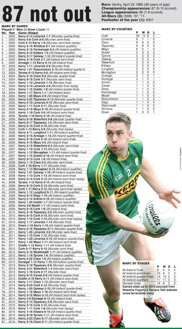 When a hamstring injury ruled Marc out of the 2012 Munster opener against Tipperary, it ended a remarkable eight-year run of consecutive starts for Kerry. From the 2004 Munster final to the 2011 All-Ireland final, he featured in Kerry’s starting SFC team on 50 straight occasions.