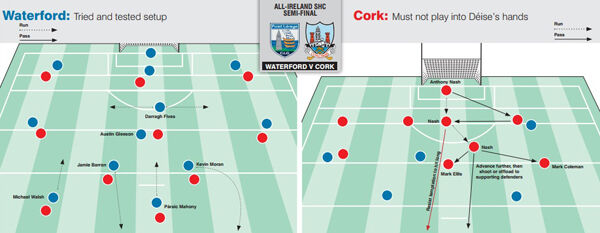 The loose defender always initiates attacks. At the other end of the field, putting extreme pressure on Darragh Fives to offload backwards would be a good starting point for Cork. This would disrupt the Déise’s well-practised tactic of building from the back. Stopping Jamie Barron from making his trademark forward runs will also be essential.