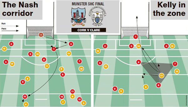 Cork centre-backs invariably play a zonal role. They patrol the centre, 50m or so from their goal. This affords the dangerous Kelly carte blanche to move unmarked into an open area and on his favoured left side to shoot points or to pick out John Conlon.