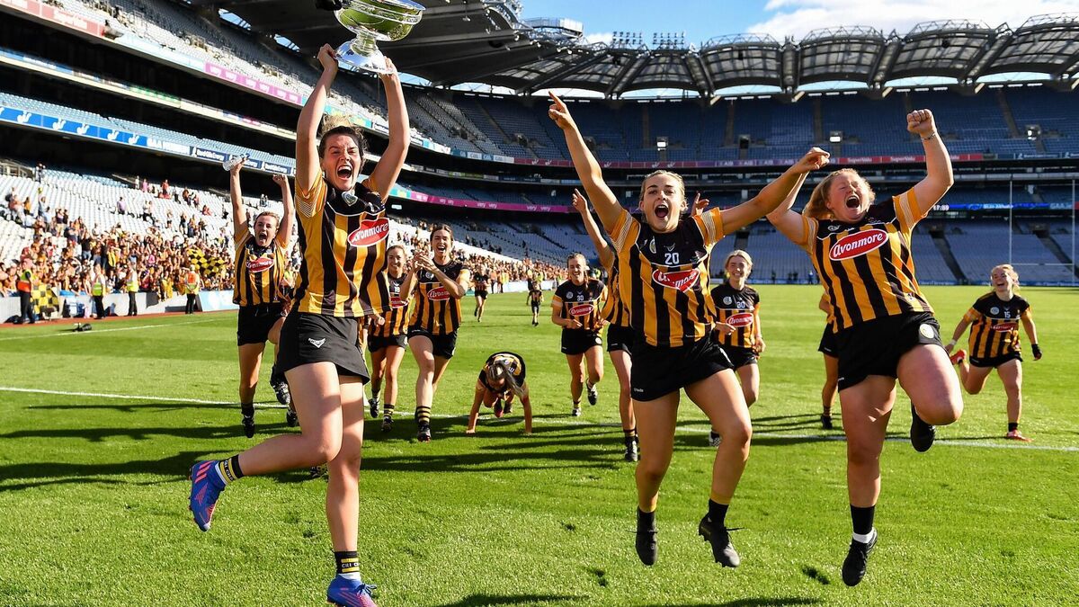 JUMPING FOR JOY: Kilkenny captain Aoife Prendergast, left, celebrates with the O'Duffy Cup and teammates after their side's victory over Cork. Pic: Seb Daly/Sportsfile
