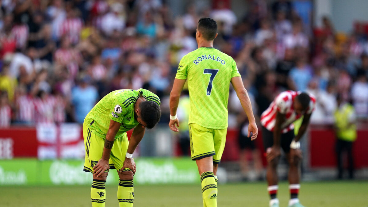 REVIVAL: Manchester United's Bruno Fernandes, (left) is dejected at the final whistle as team mate Cristiano Ronaldo walks off during the Premier League match at the Gtech Community Stadium, Brentford. Pic: PA