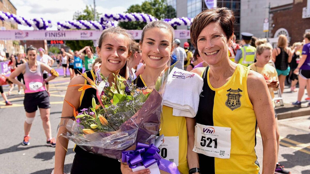 HARNESSING SUCCESS: Aoibhe Richardson, centre, with her mother, Niamh Richardson, right and her sister, Grace Richardson, from Kilkenny City Harriers celebrate finishing the 2019 Vhi Women's Mini Marathon. Picture: Sam Barnes/Sportsfile