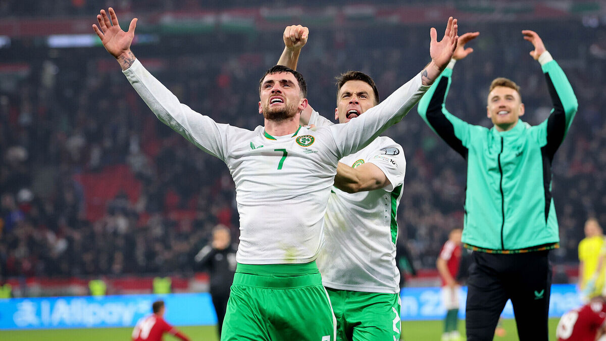 Ireland’s Troy Parrott and Séamus Coleman celebrate after the match