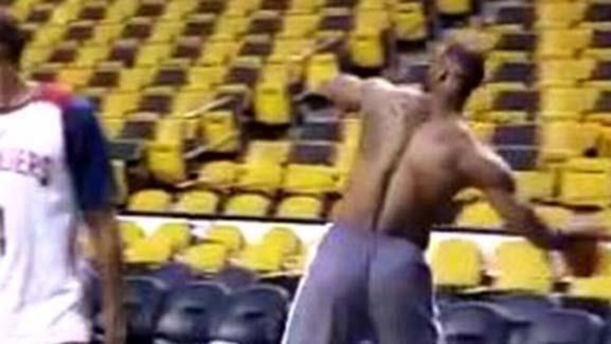 The 6’8” basketball star was chatting with team-mates on the baseline before he took a single step forward and casually unleashed the one armed throw.