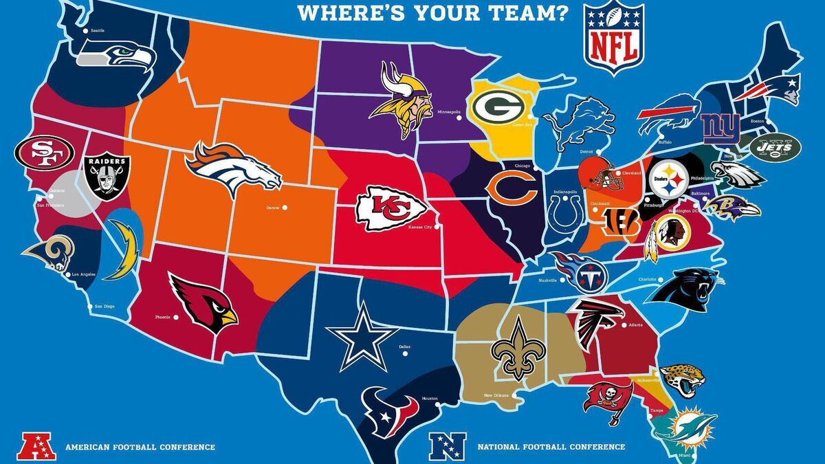 The 32-team NFL is divided into 16-team AFC and NFC conferences, each with four divisions.