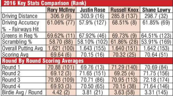 By way of comparison and areas from improvement, I have decided to compare Lowry’s performance last year on the PGA Tour, to that his fellow Europeans — ranked above him, Rory McIlroy (2) Justin Rose (13) and Russell Knox (19), in the accompanying table.