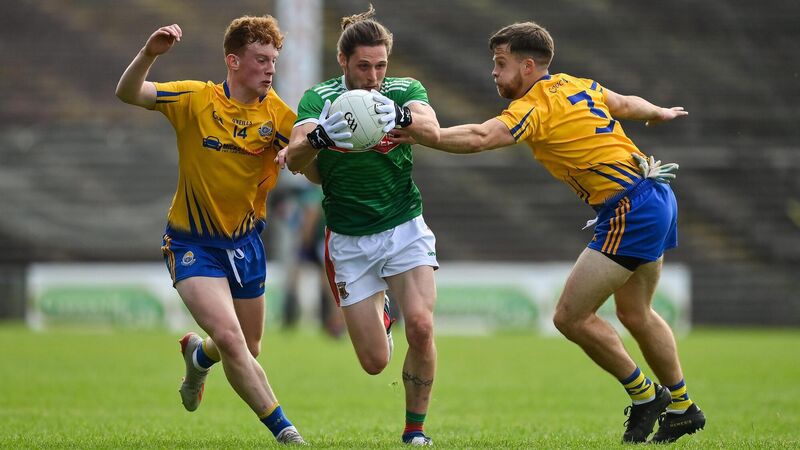 Padraig O'Hora of Ballina Stephenites is tackled by Aiden Orme, left, and David McHale of Knockmore during the Mayo County Senior Football Championship Semi-Final match between Knockmore and Ballina Stephenites at Elvery's MacHale Park in Castlebar, Mayo. Photo by Brendan Moran/Sportsfile