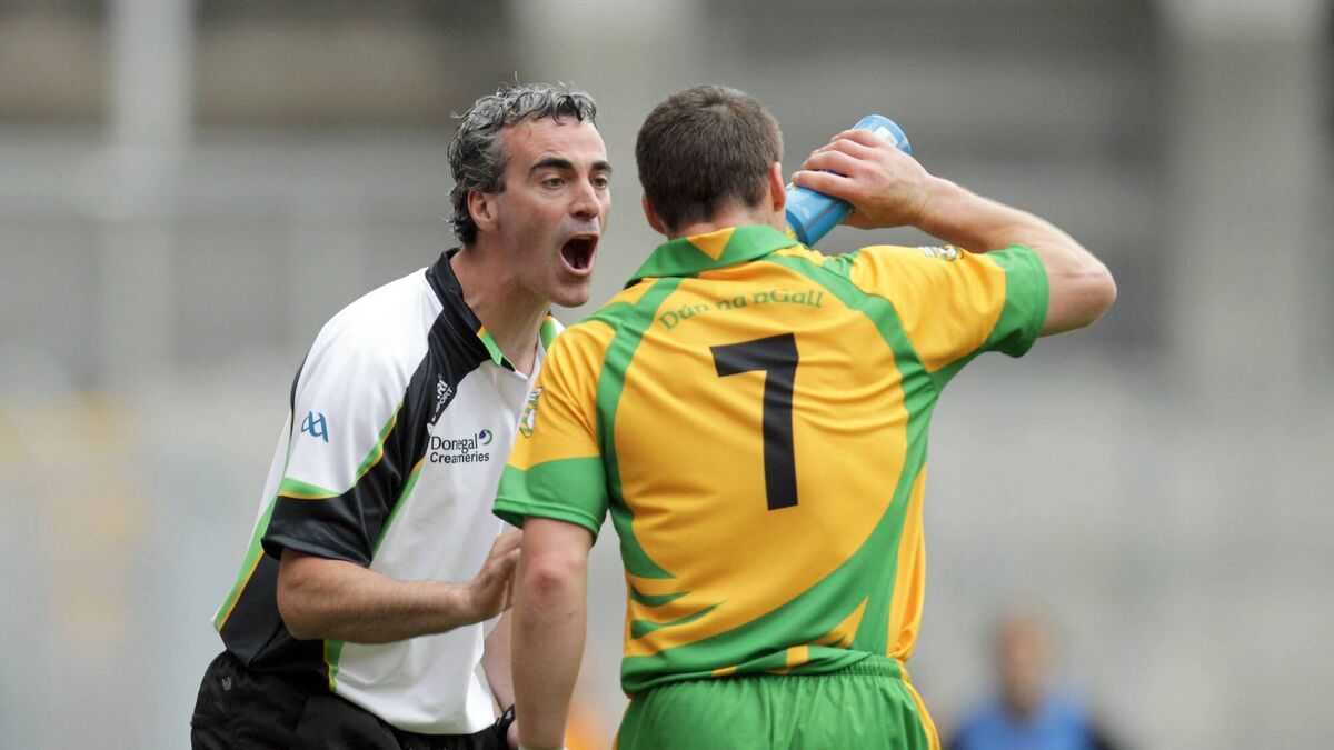 Donegal Manager Jim McGuinness gives encouragement to Kevin Cassidy duering the 2011 Championship.