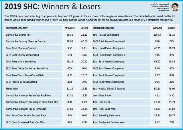 Winners had a 64% win rate on their own puckouts and completed 79% of their passes. They had 50.81 hooks, blocks or tackles compared with 45 on the losing side.