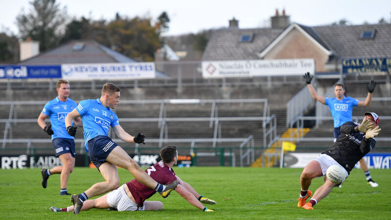 Con O'Callaghan of Dublin shoots to score his side's second goal past Galway goalkeeper Bernard Power and Sean Mulkerrin. Picture: Ramsey Cardy/Sportsfile