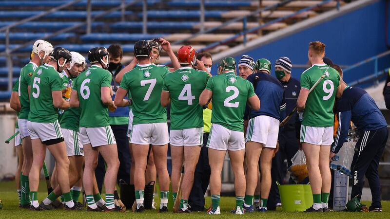 The Limerick team during their water break in the Munster SHC clash with Clare. Picture: Daire Brennan/Sportsfile