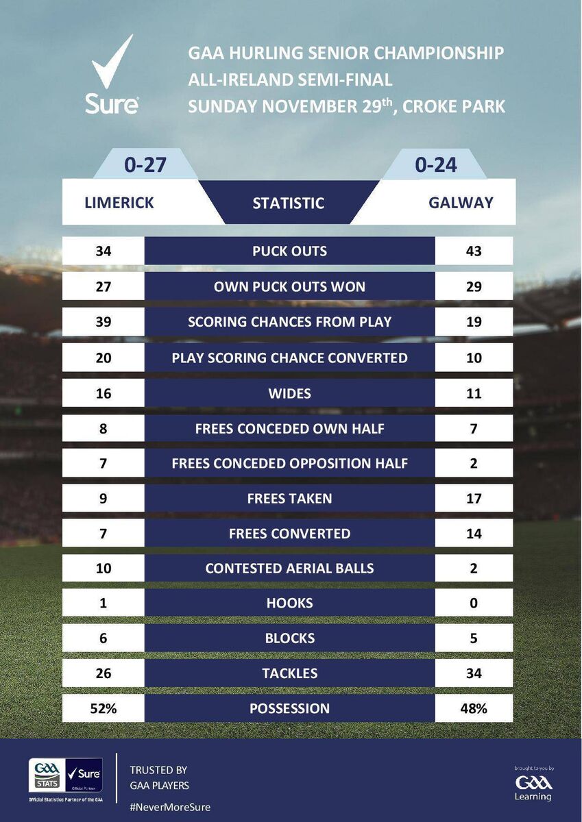 Three huge saves by Éanna Murphy in the second half kept Galway in this encounter but then they leaked so much from their restarts - 14 of his restarts were lost compared to seven for Limerick. There was the winning and losing of the game in those statistics alone.