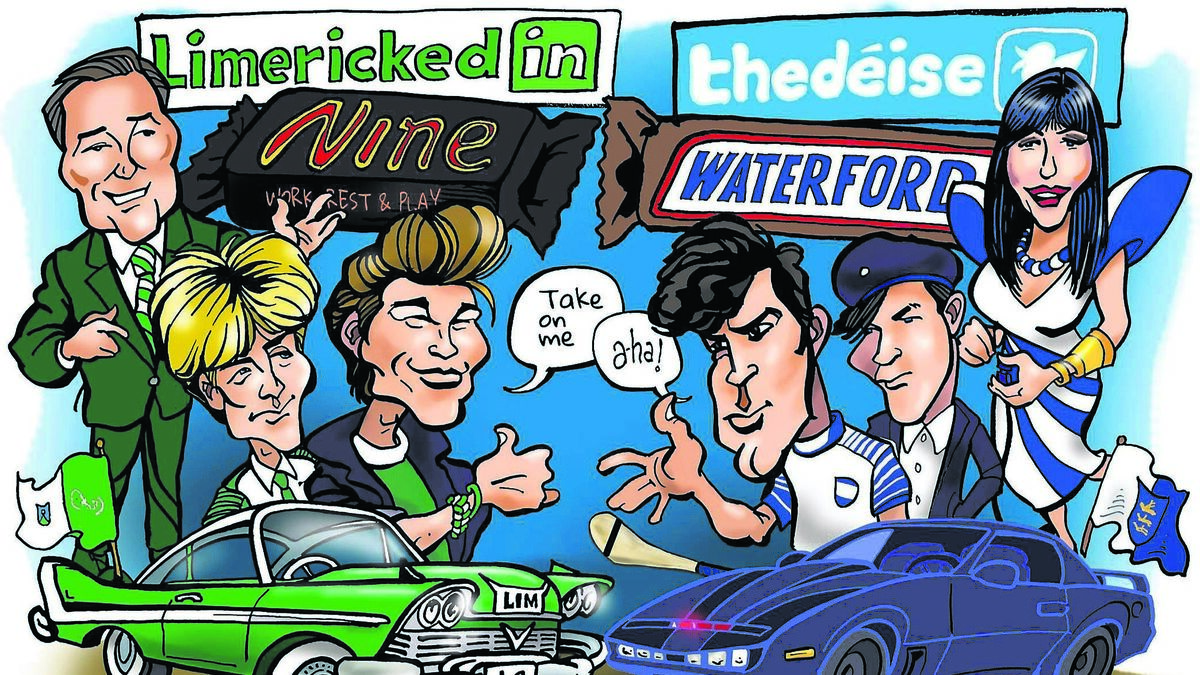 GREEN OR BLUE? In the green corner is Martin King, LinkedIn, Mars bar, A-ha, and Christine the car. In the blue corner is the Accessories, Jean Byrne, KITT, Twitter, and Snickers/Marathon. Illustration: Peadar Drinan
