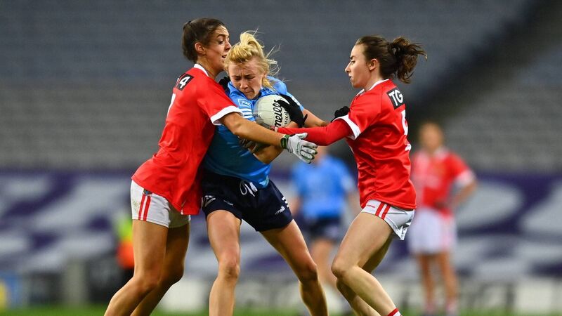 Dublin's Carla Rowe is tackled by Erika O'Shea, left, and Melissa Duggan of Cork at Croke Park during December's All-Ireland final. Photo by Eóin Noonan/Sportsfile