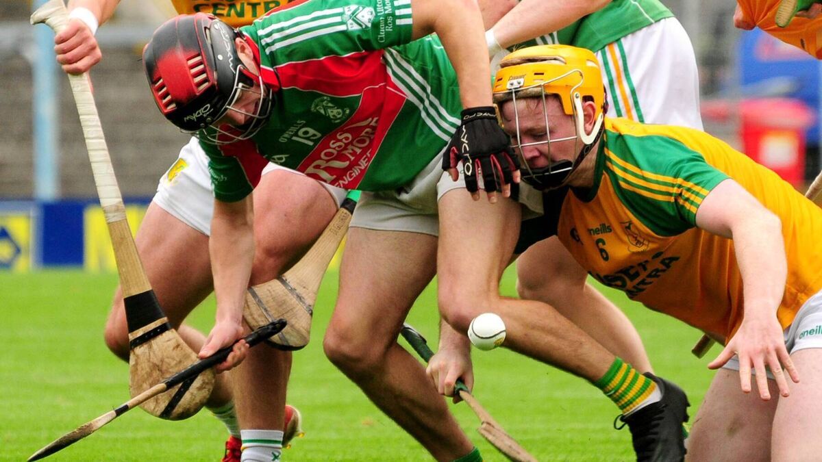 James Hammersley of Clonoulty Rossmore and Toomevara's Liam Ryan fight for possession. Photo by Eamonn McGee