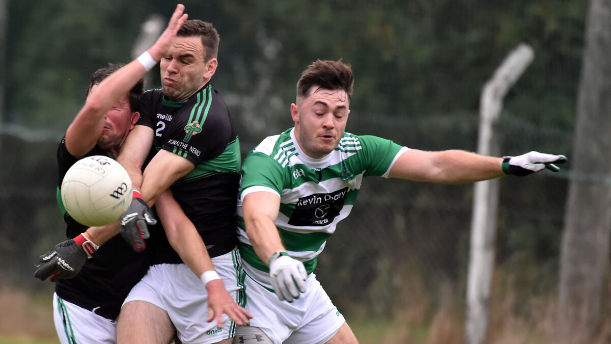 BIG SQUEEZE: Nemo Rangers’ Colin O’Brien and Briain Murphy combine to stop Valley Rovers’ Billy Crowley in the Bon Secours Cork PSFC clash at Ballygarvan. Both sides remain in the hunt for a knockout place. Picture: Eddie O’Hare