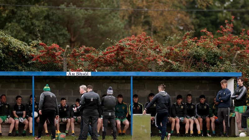 The Ballinamore Sean O'Heslins team prepare for the Leitrim SFC final outside as no dressing rooms were available to club teams due to Covid 19 restrictions