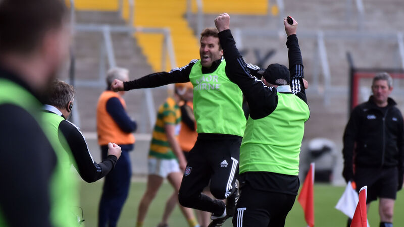 Midleton manager Ger Fitzgerald and coach Ben O'Connor celebrate at the final whistle after beating champions Blackrock. Picture: Eddie O'Hare